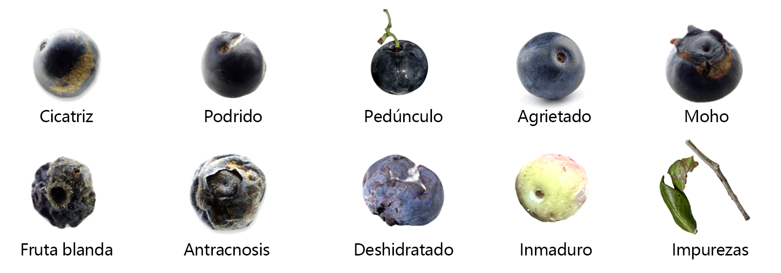 ✦ Detección de precisión sin precedentes de diversos defectos en arándanos mediante el análisis de color, tamaño, forma y características textura: