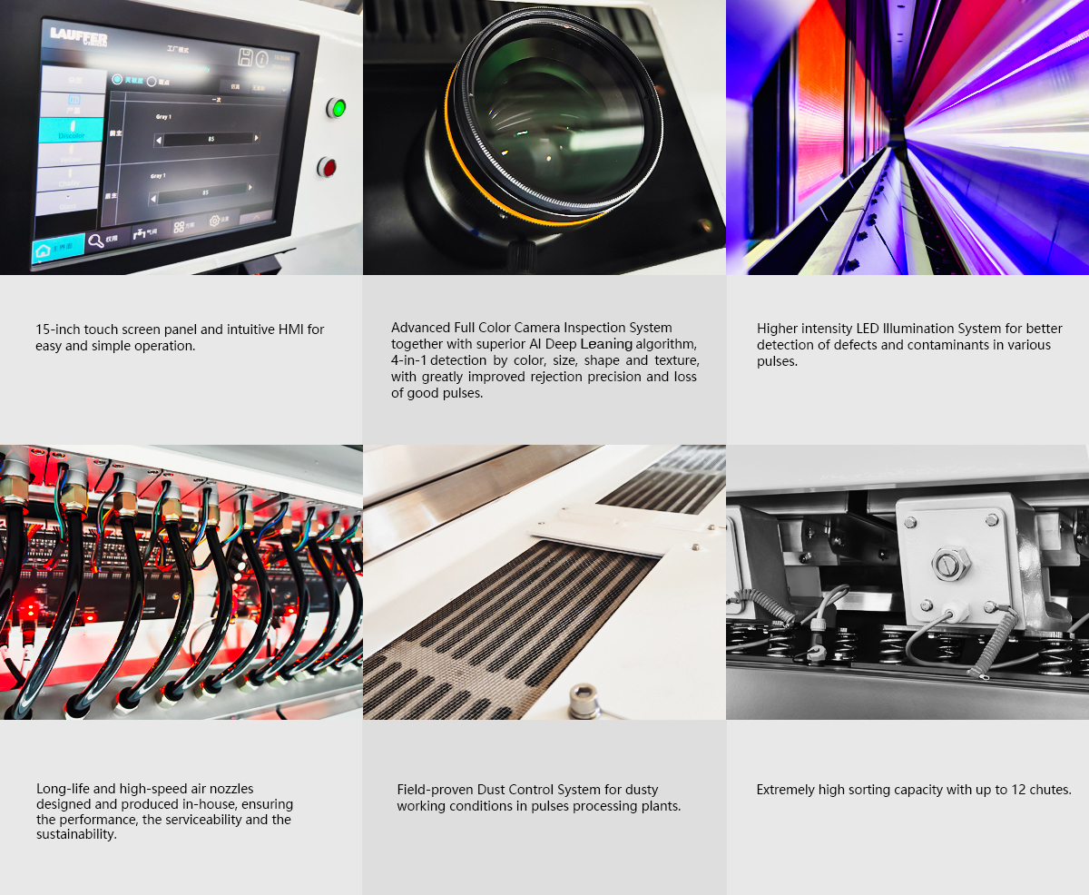 Designed for pulse processing plants, grain storage, exporter and organic food production worldwide to enable cost-effective quality control through precisely removing defects, foreign materials and diseased grains by multispectral imaging and AI algorithms, while maximizing yield and quality, strengthening market competitiveness